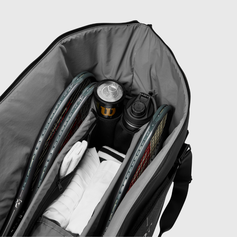 Túi Đựng Vợt Tennis Wilson RF Practice Một chiếc ba lô đựng sáu cây vợt được thiết kế lấy cảm hứng từ quê hương của Roger Federer.